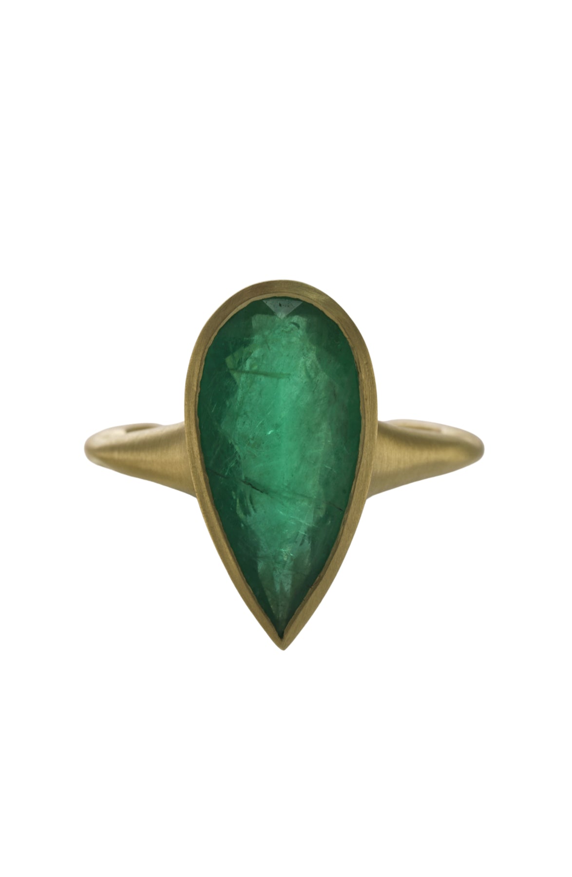 From our Green Muse Collection, striking in its simplicity, this bold ring showcases a single 4.10 ct Colombian emerald, bezel-set in buttery matte 18k yellow gold. The dramatic pear cut and glowing green hue make this a statement piece with quiet confidence.