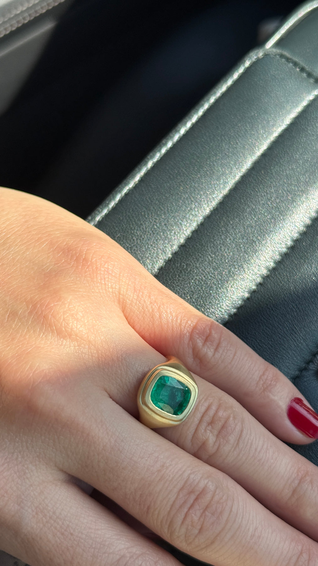 A sculptural piece that brings presence without noise. The Pascal Ring features a 2.9 ct Colombian emerald in a softly rounded bezel. Its deep green tone stands out against the weighty 18k matte gold, molded with gentle sloping curves. A quiet show of power.